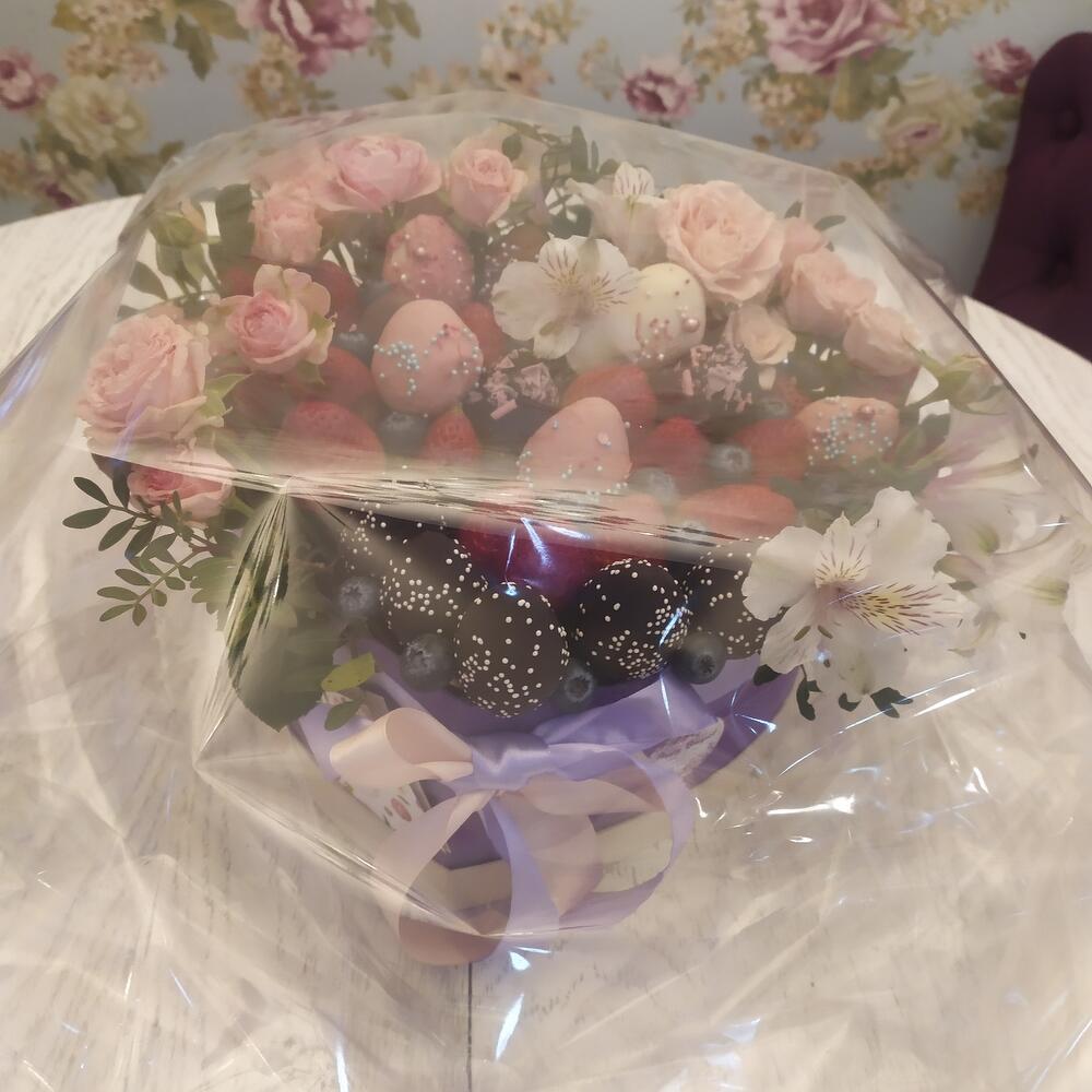 Альстромерия – 2 шт.Клубника – 20 шт.Роза кустовая – 3 шт.Коробка сердце – 1 шт.Голубика – 100 гр.Фисташка пучок – 5 шт.Клубника в шоколаде – 20 шт.Дизайнерская упаковка – 1 шт.