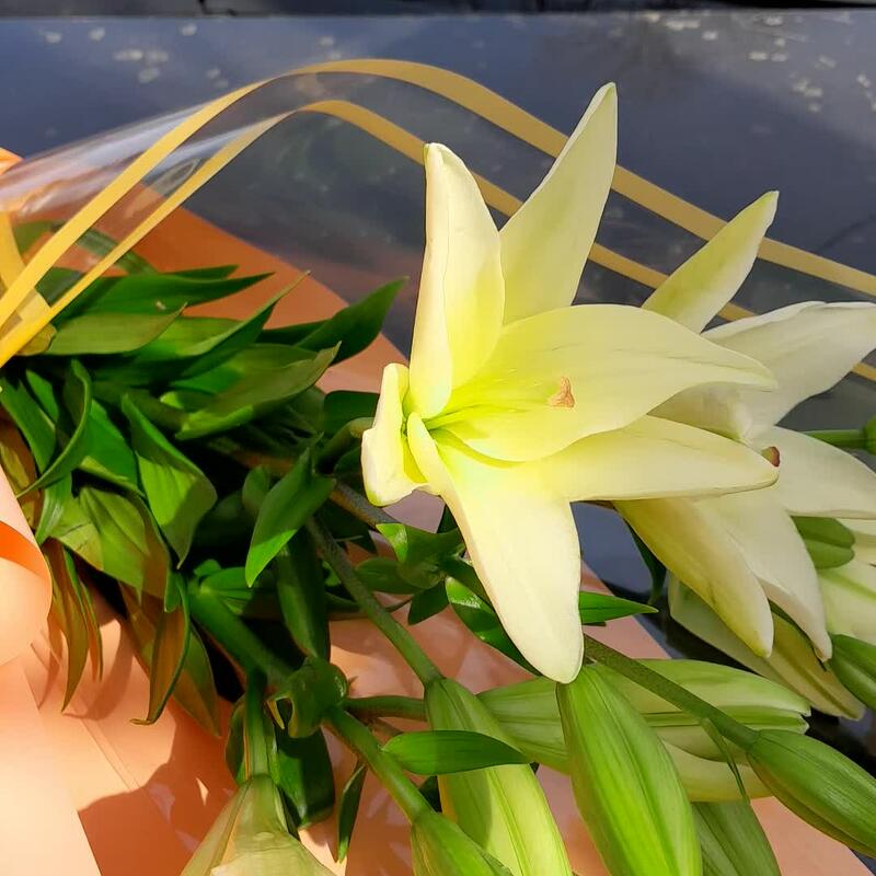 Лилия Азиатская белая – 3 шт.Упаковка дизайнерская – 3 шт.Лента атласная – 2 шт.