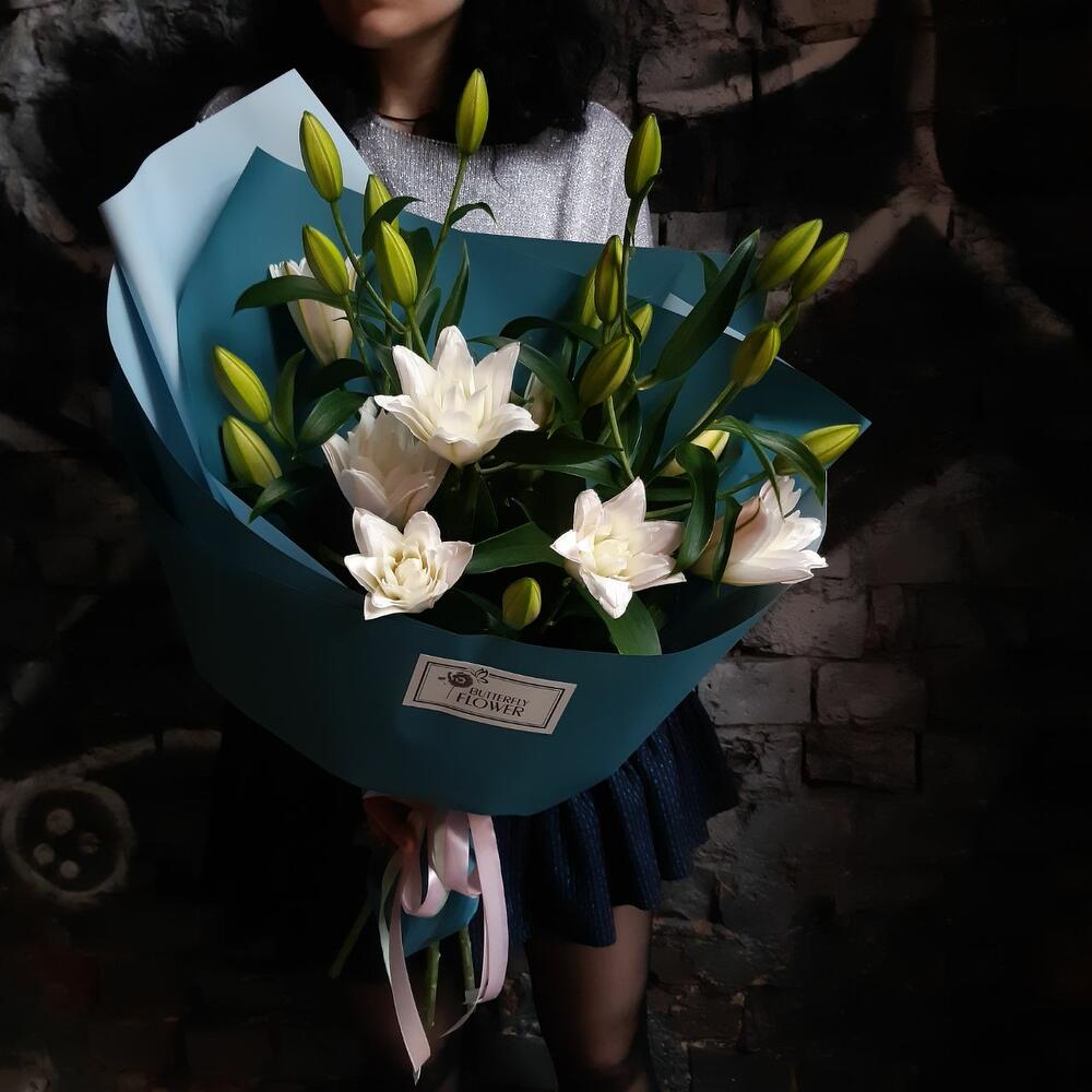 Букет из 5 махровых лилий в стильной упаковке “Дроэда”