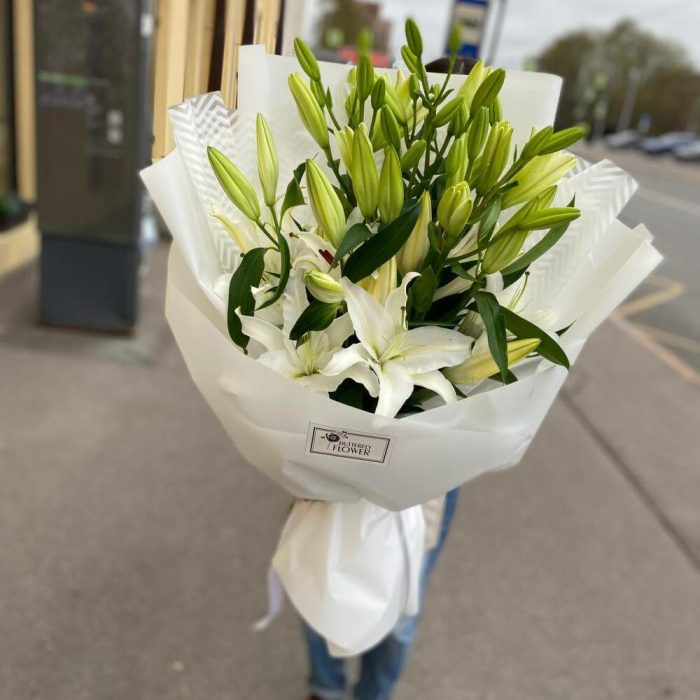 Букет из 9 белых лилий в дизайнерской упаковке “Ливерпуль”