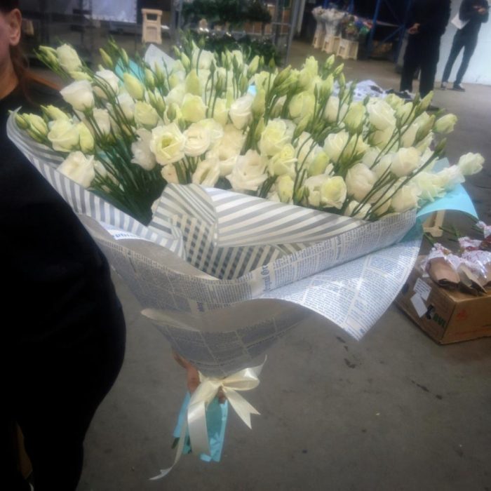 Эустома – 19 шт.Упаковка крафт дизайнерский – 3 шт.Упаковка дизайнерская – 3 шт.Упаковка пленка матовая – 3 шт.Лента атласная – 2 шт.