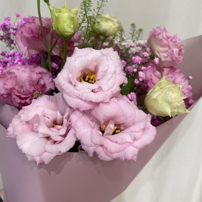 Эустома – 4 шт.Тласпи – 2 шт.Гипсофила – 2 шт.