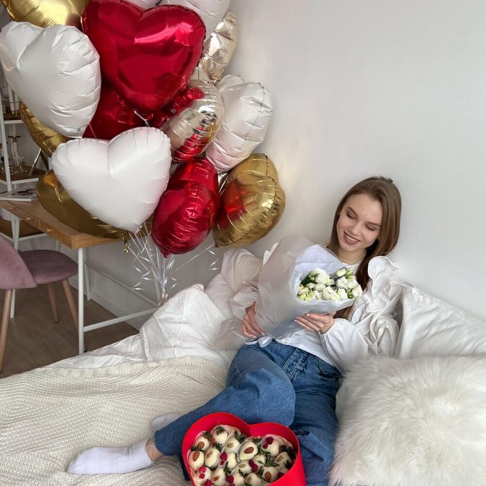 эустома белая – 5 шт.сердце фольгированное – 20 шт.клубника в бельгийском шоколаде – 22 шт.бокс сердце – 1 шт.