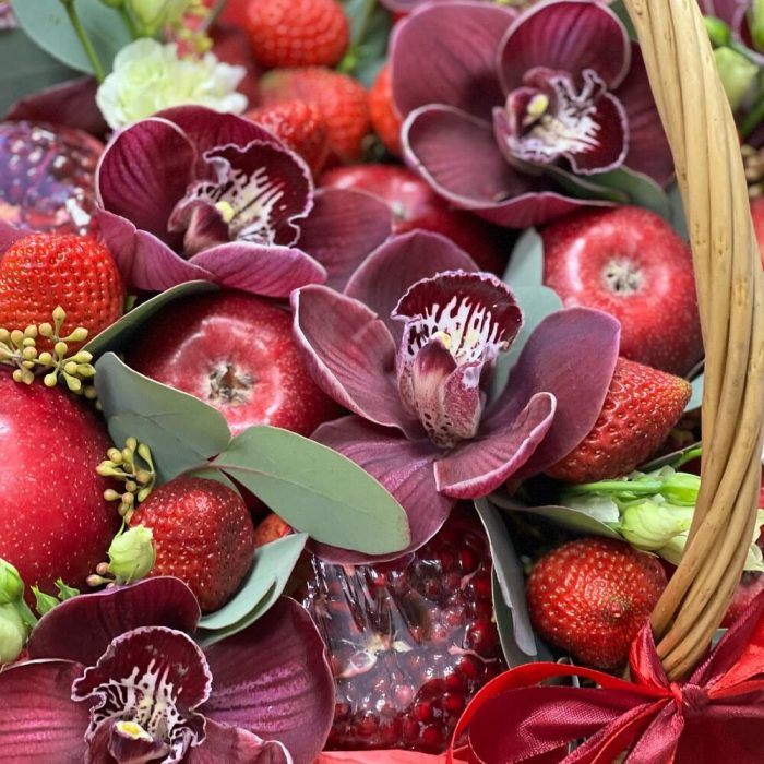 Гранат – 3 шт.яблоки красные – 9 шт.Клубника – 10 шт.Орхидея Цимбидиум – 7 шт.эустома светлая – 11 шт.Корзина – 1 шт.Оазис флористический – 2 шт.Тишью – 5 шт.эвкалипт ветки мини – 7 шт.Лента атласная – 2 шт.работа флориста – 1 шт.