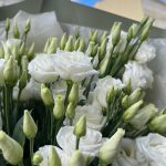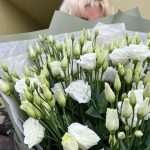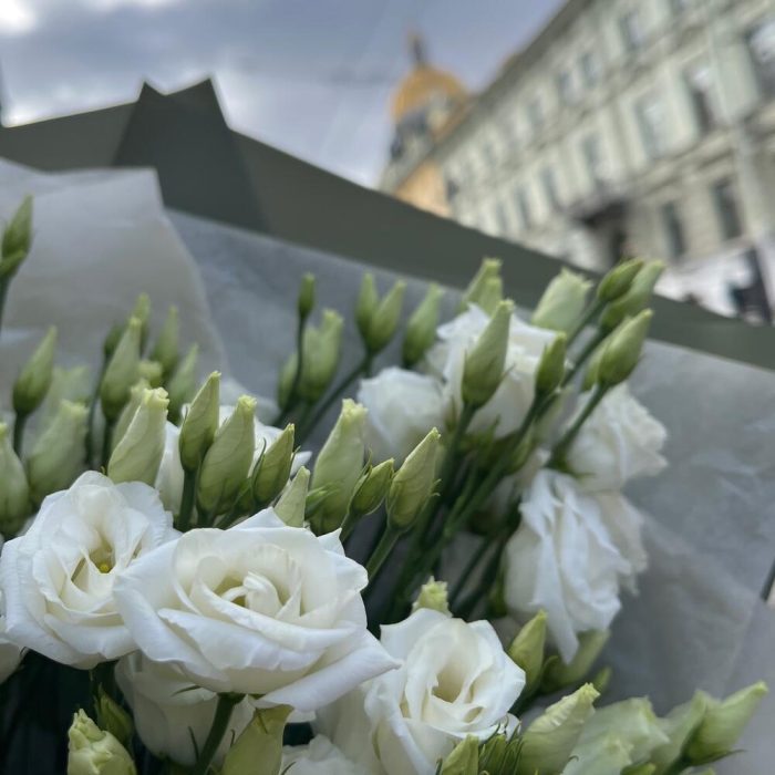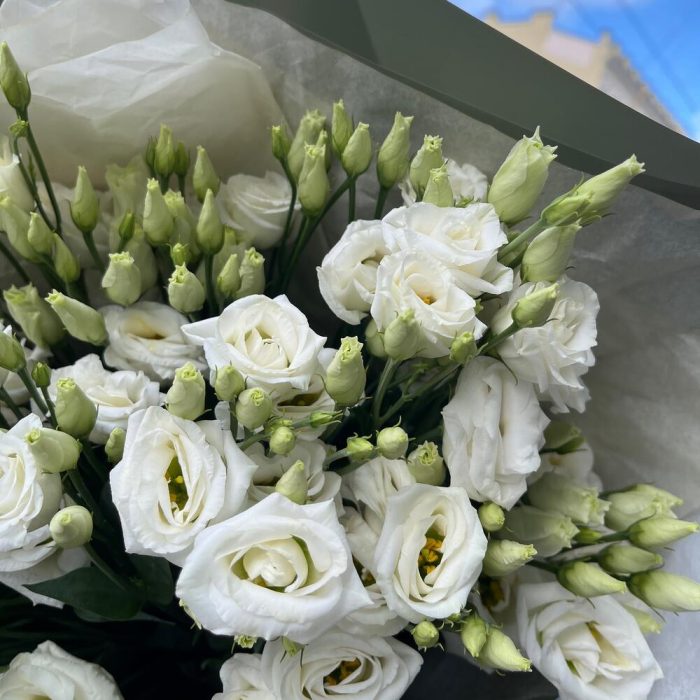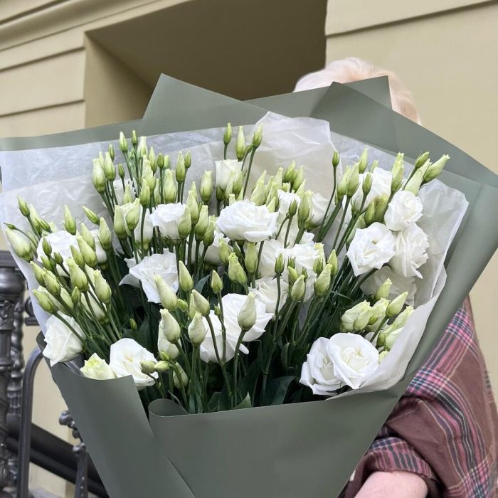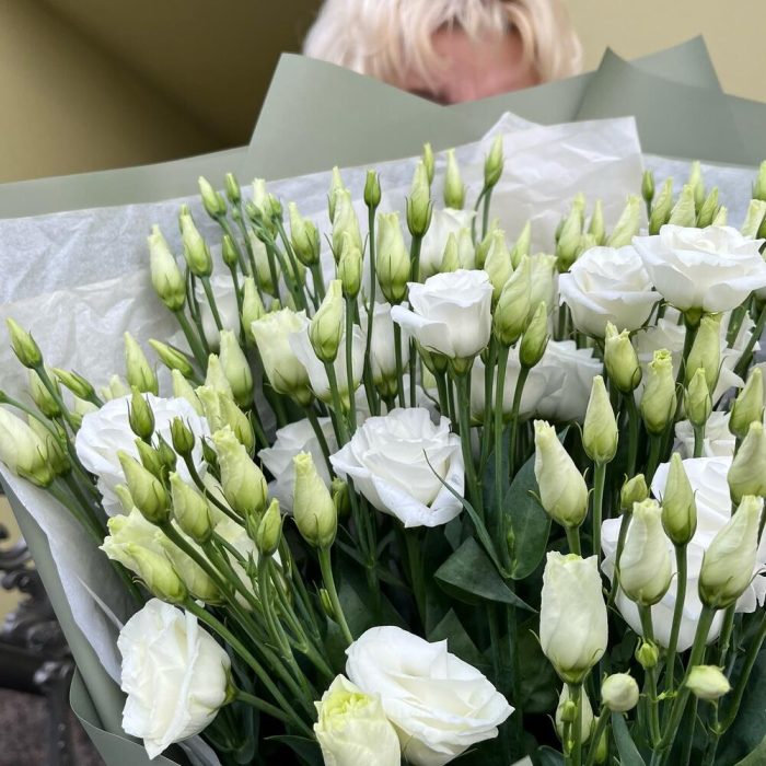Лента атласная – 2 шт.Лизиантус белый – 9 шт.Упаковка корейская пленка – 1 шт.тишью кремовое – 1 шт.