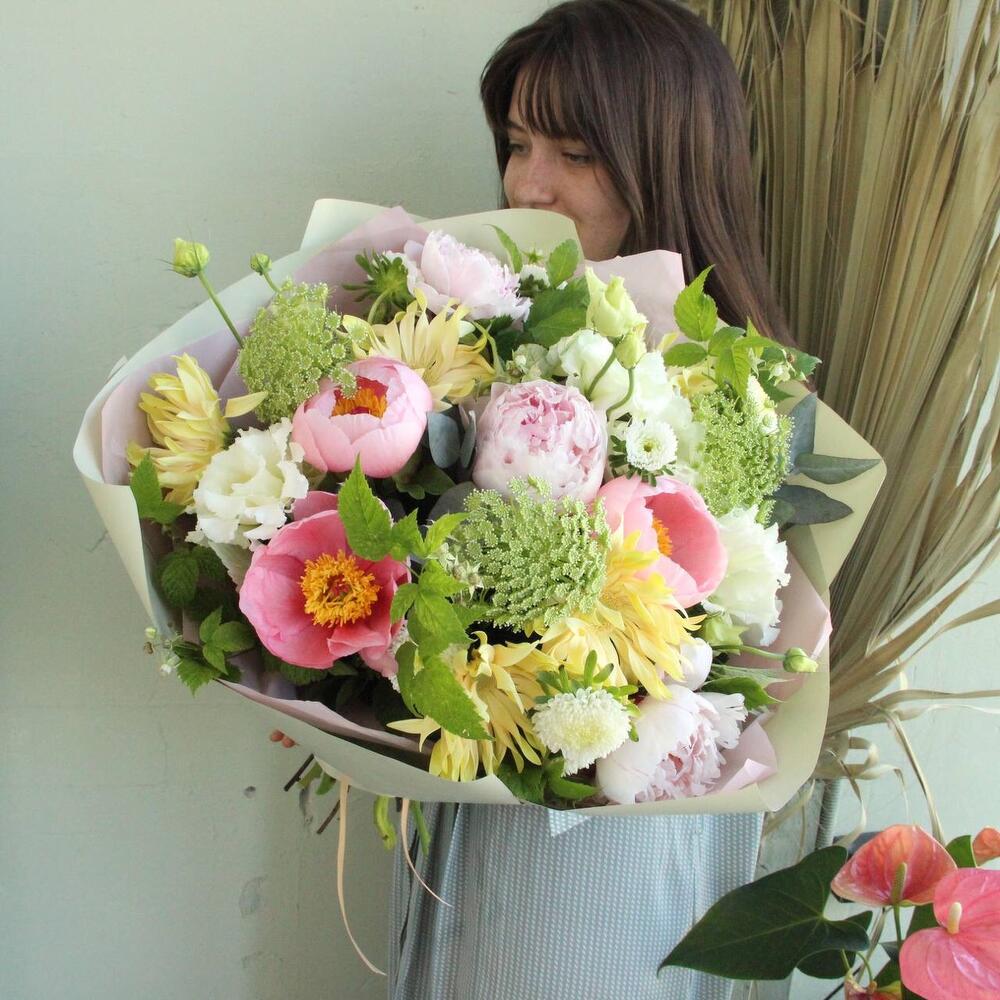 Авторский букет с пионами, ветками малины, кучерявыми герберами, лизиантусом, амми и ароматным эвкалиптом.Стильное цветочное решение для любого случая.