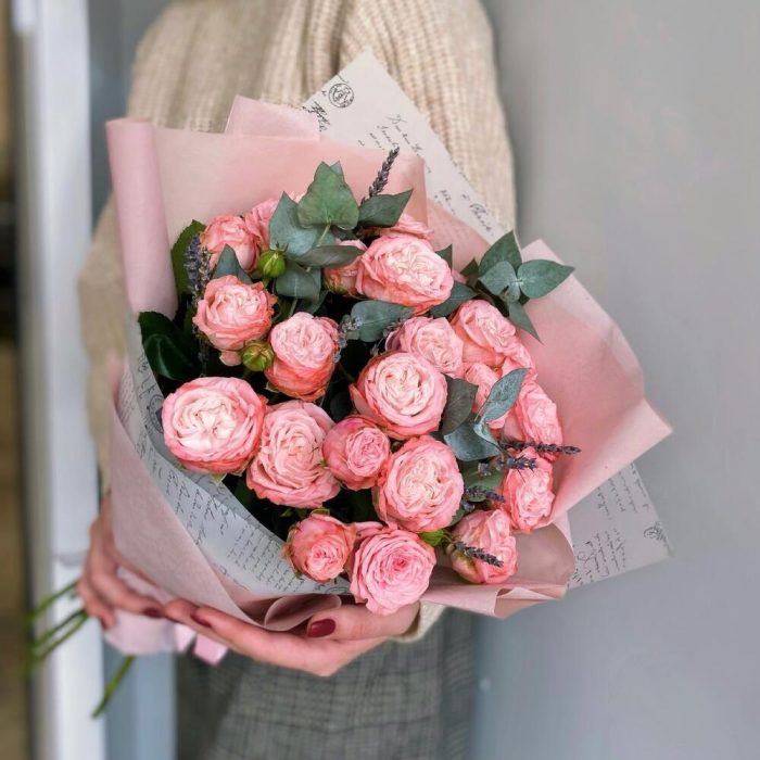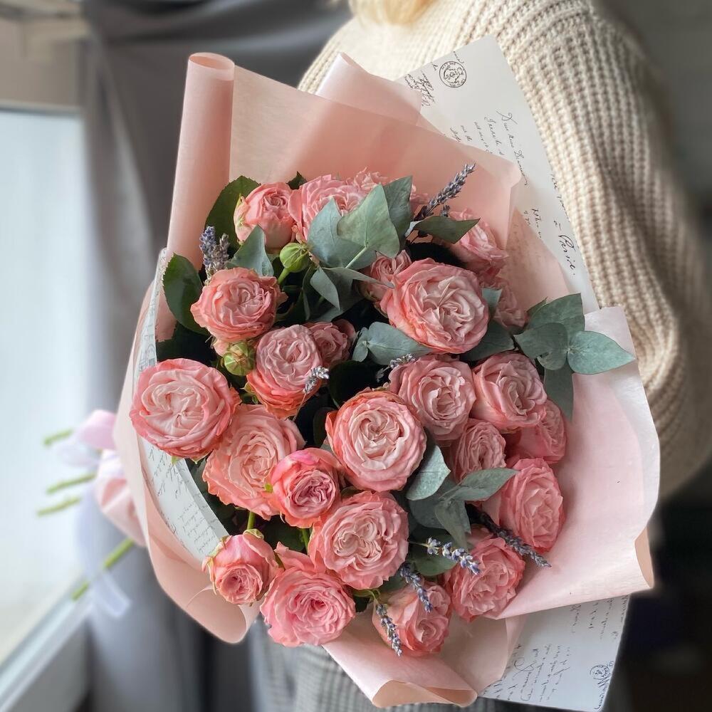 Мадам бомбастик – 13 шт. Эвкалипт – 3 шт. Упаковка дизайнерская – 2 шт. Атласная лента – 1 шт. Открыточка с вашими пожеланиями – 1 шт. доставка – 1 шт.