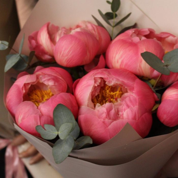 Эвкалипт – 3 шт.Лента атласная – 1 шт.Пленка матовая – 2 шт.Пион коралл шарм – 5 шт.