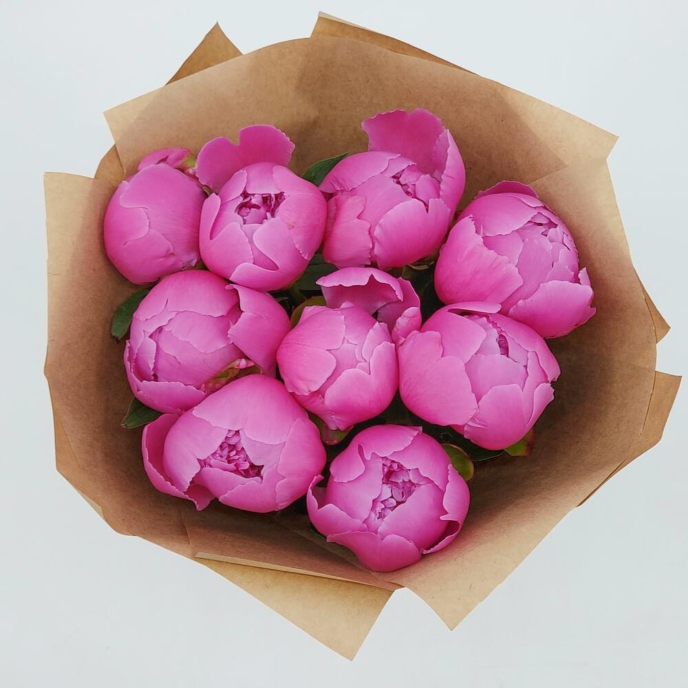 Пион – 9 шт.Лента атласная – 1 шт.Упаковка крафт – 3 шт.