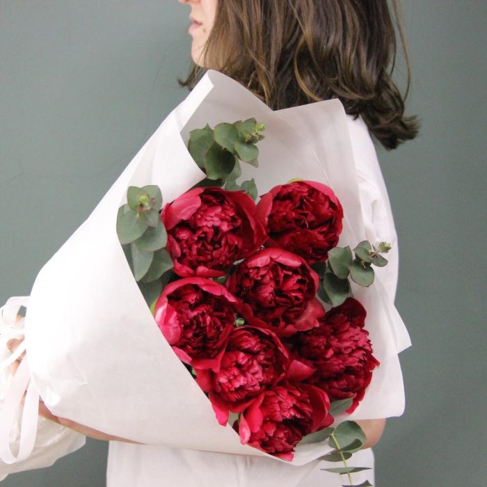 Пион – 7 шт.Эвкалипт – 4 шт.Лента атласная – 1 шт.Бумага – 2 шт.