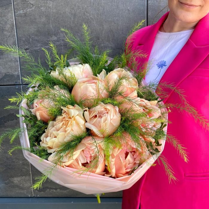 Лента атласная – 1 шт.Упаковка дизайнерская – 2 шт.зелень декоративная пучок – 1 шт.пионы крем ( италия) – 9 шт.