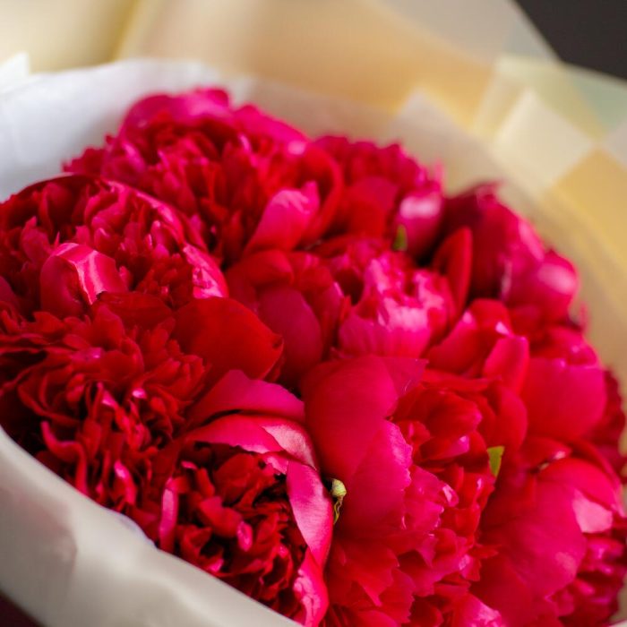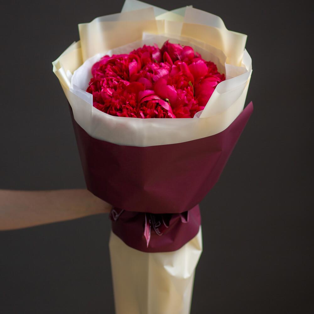 Атласная лента – 2 шт.Пион бордовый – 11 шт.Корейская пленка – 2 шт.тишью белая – 1 шт.
