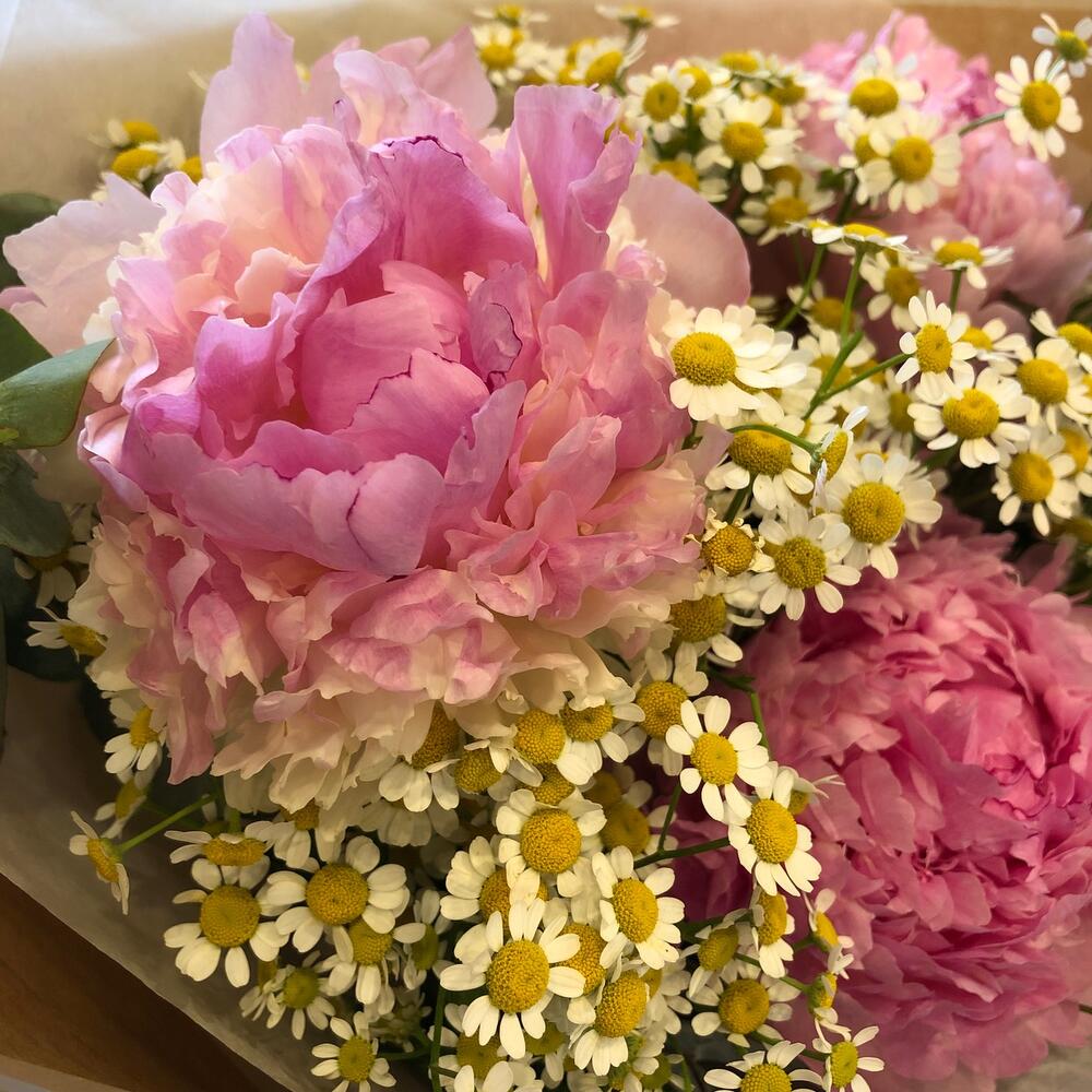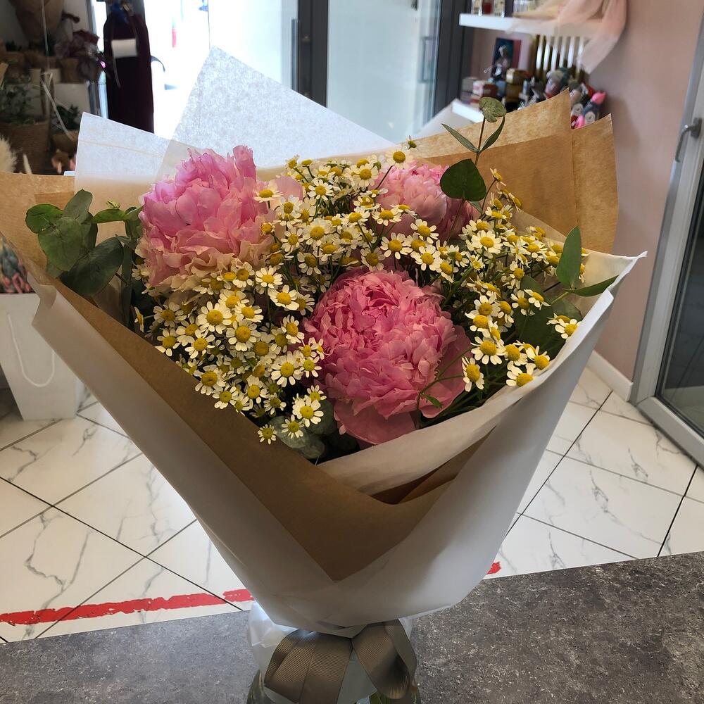 Летний букет с пионами и ромашкой