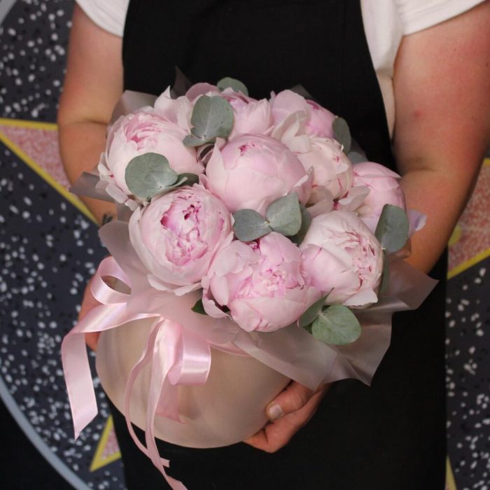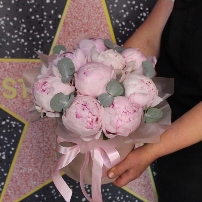 Эвкалипт – 2 шт.Лента атласная – 1 шт.Шляпная коробка – 1 шт.Пион Сара Бернар – 11 шт.Пленка матовая – 1 шт.Оазис флористический – 1 шт.