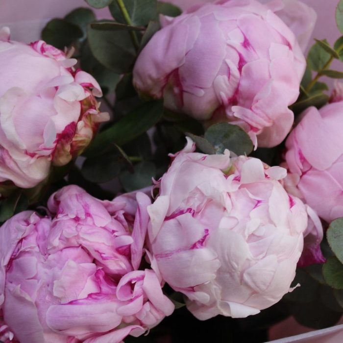 Пион Сара Бернар – 5 шт.Эвкалипт – 3 шт.Пленка дизайнерская – 1 шт.Фетр – 1 шт.