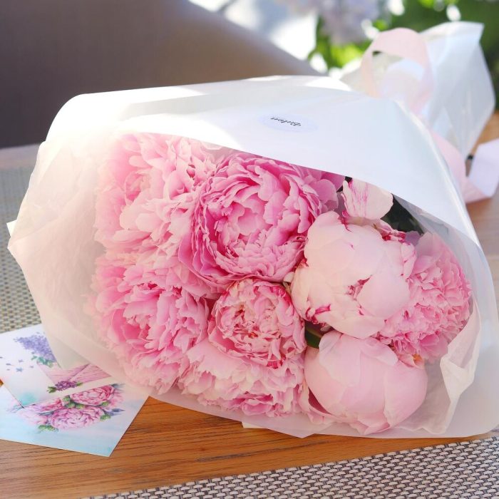 Розовый пион – 9 шт.Дизайнерская упаковка – 1 шт.Открыточка с вашими пожеланиями – 1 шт.Шоколадка – 1 шт.Транспортировочная коробка – 1 шт.инструкция по уходу за цветами – 1 шт.