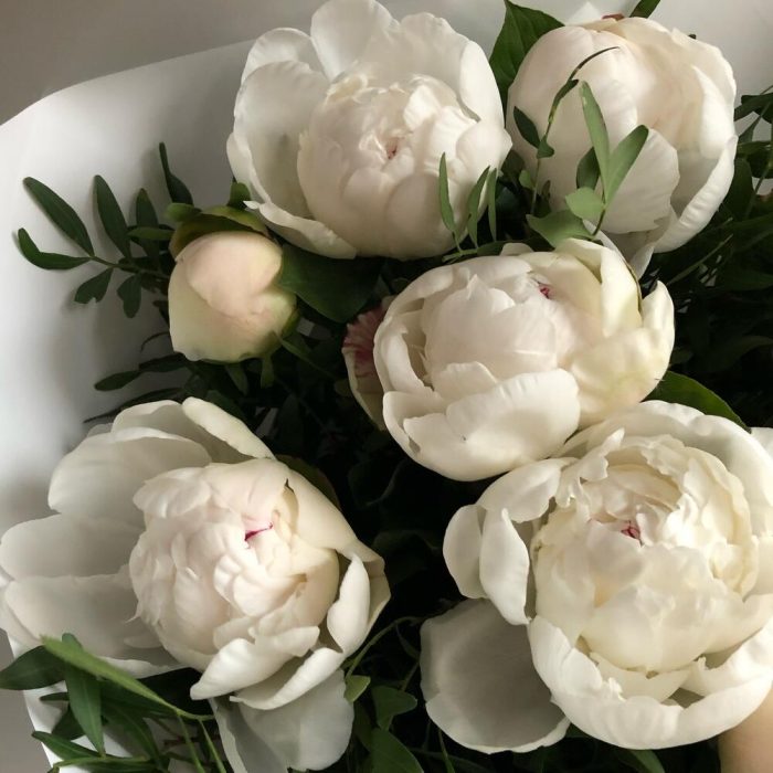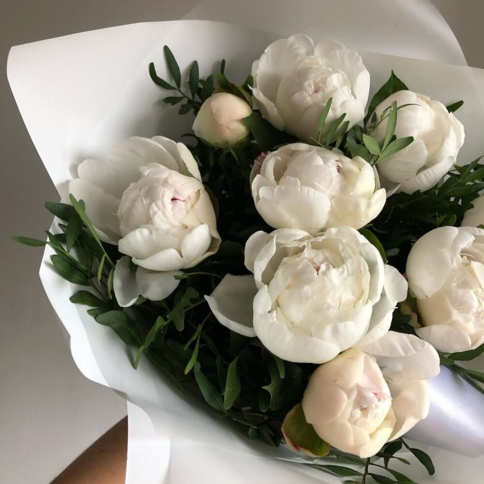 Лента – 2 шт.Зелень – 8 шт.Пион белый – 9 шт.Упаковка дизайнерская – 4 шт.
