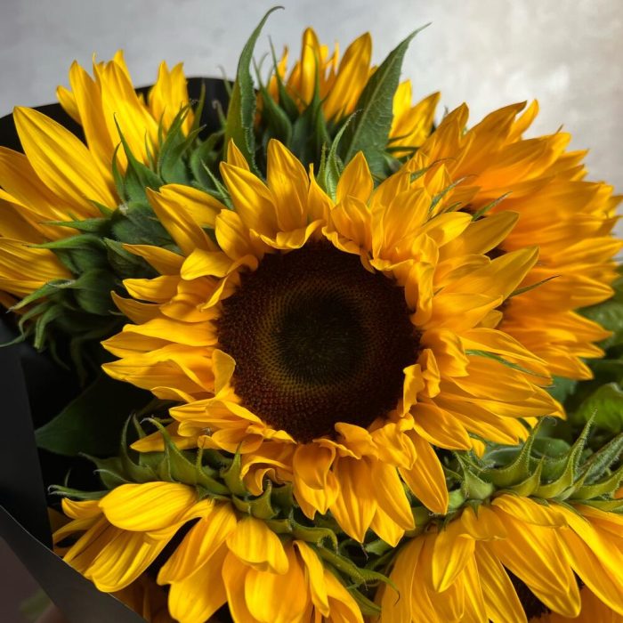 Атласная лента – 1 шт.Подсолнух желтый – 9 шт.декоративная упаковка – 1 шт.