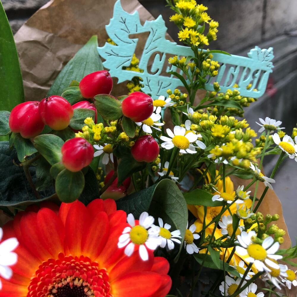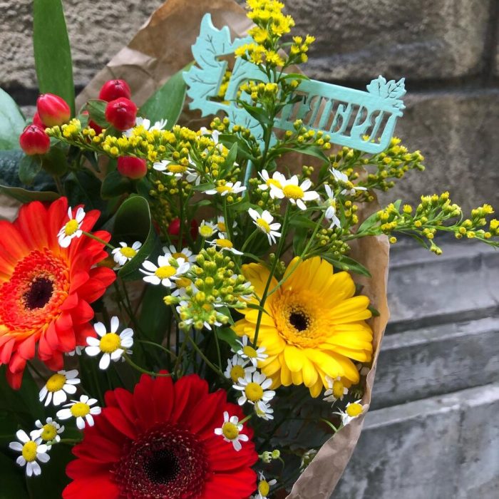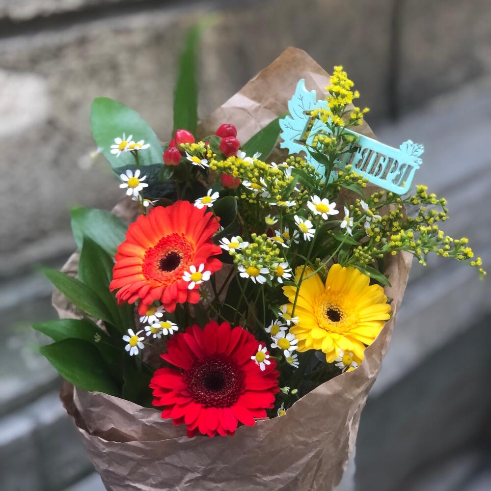 Гермини – 3 шт.Танацетум – 1 шт.Солидаго желтое – 1 шт.Рускус – 3 шт.Папоротник – 1 шт.Крафт упаковка – 1 шт.Лента атласная – 1 шт.