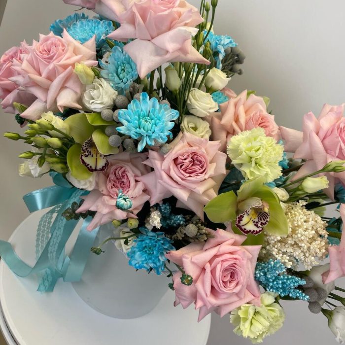 Лента – 3 шт.Орхидея Цимбидиум – 3 шт.Хризантема кустовая – 5 шт.Эвкалипт – 2 шт.Эустома – 10 шт.Диантус – 5 шт.Коробка шляпная – 1 шт.Фисташка – 3 шт.Роза пионовидная – 11 шт.Оазис флористический – 2 шт.удлинитель для орхидеи – 3 шт.пампасная трава – 3 шт.сарго сухоцвет – 7 шт.
