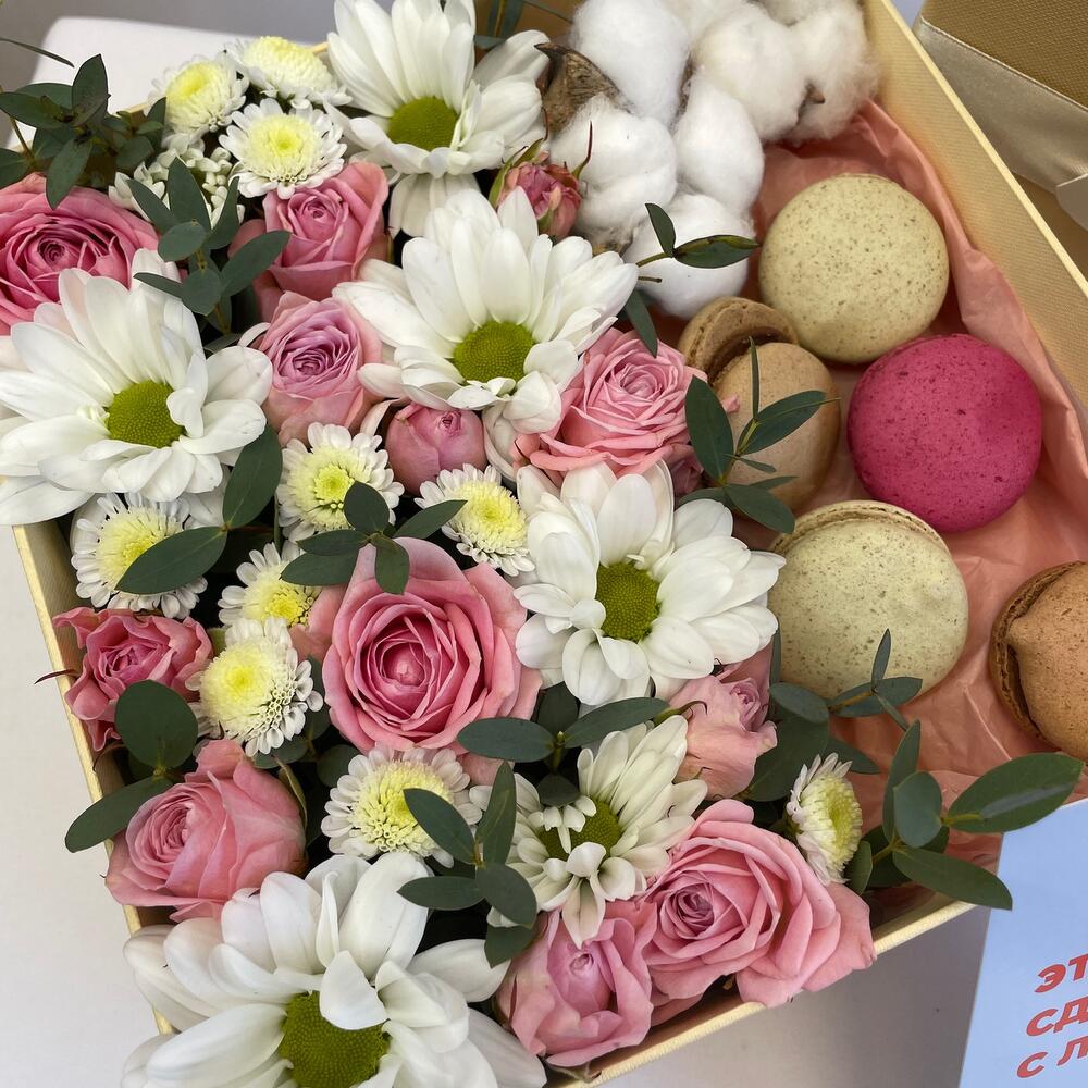 Кустовая роза – 5 шт.Коробка подарочная – 1 шт.Фисташка – 1 шт.Хлопок натуральный – 2 шт.эустома белая – 3 шт.Макарон – 6 шт.Губка флористическая – 1 шт.
