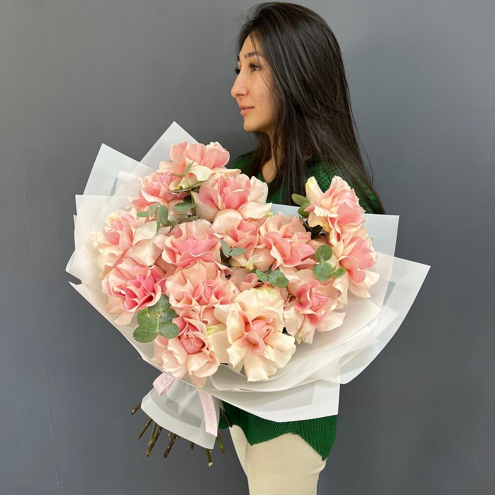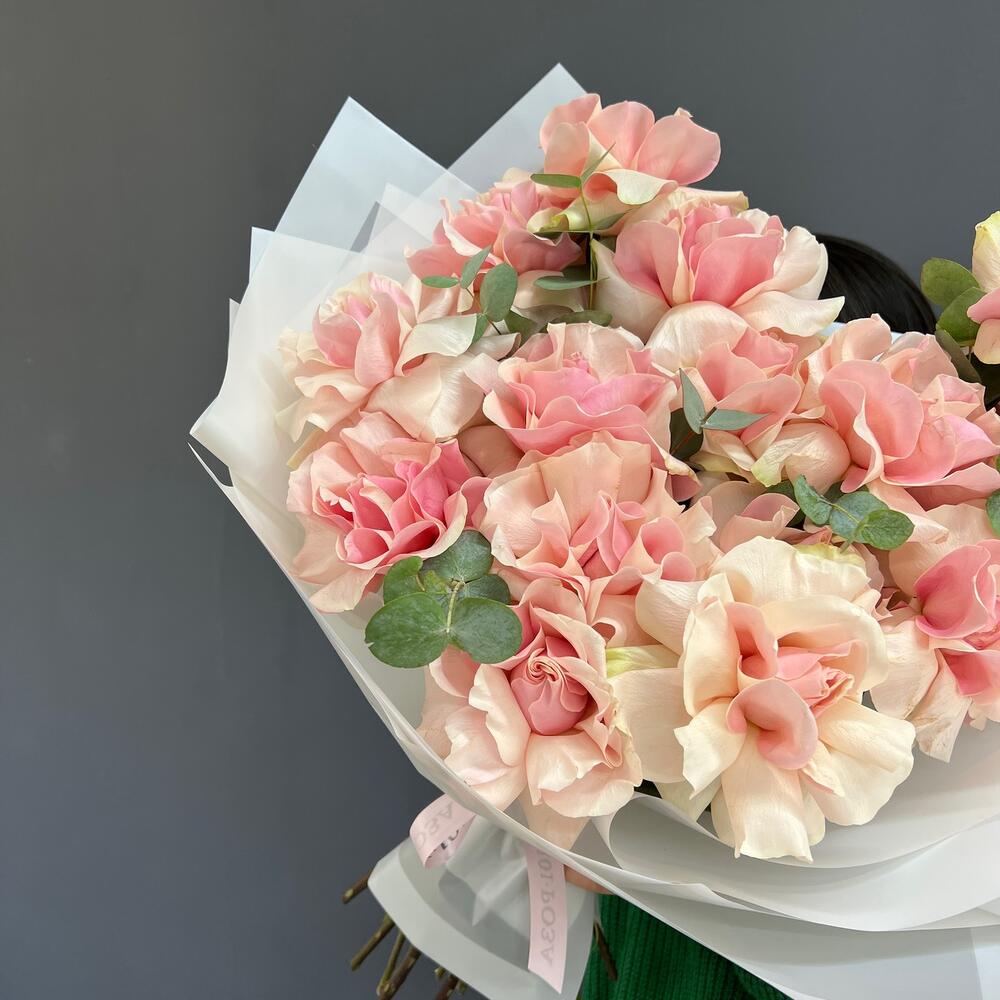 15 нежно-розовых французских роз с эвкалиптом