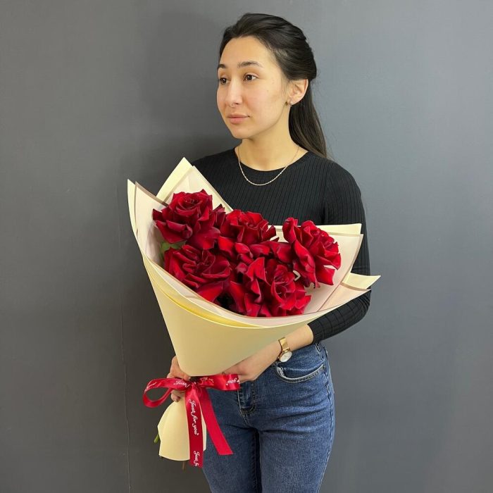 Атласная лента – 1 шт.Французская роза – 5 шт.Дизайнерская упаковка – 1 шт.