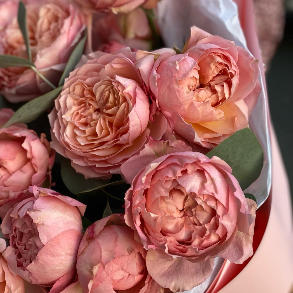 Упаковка дизайнерская – 1 шт.роза кустовая сорта джульетта – 5 шт.эвкалипт пучок микс – 1 шт.