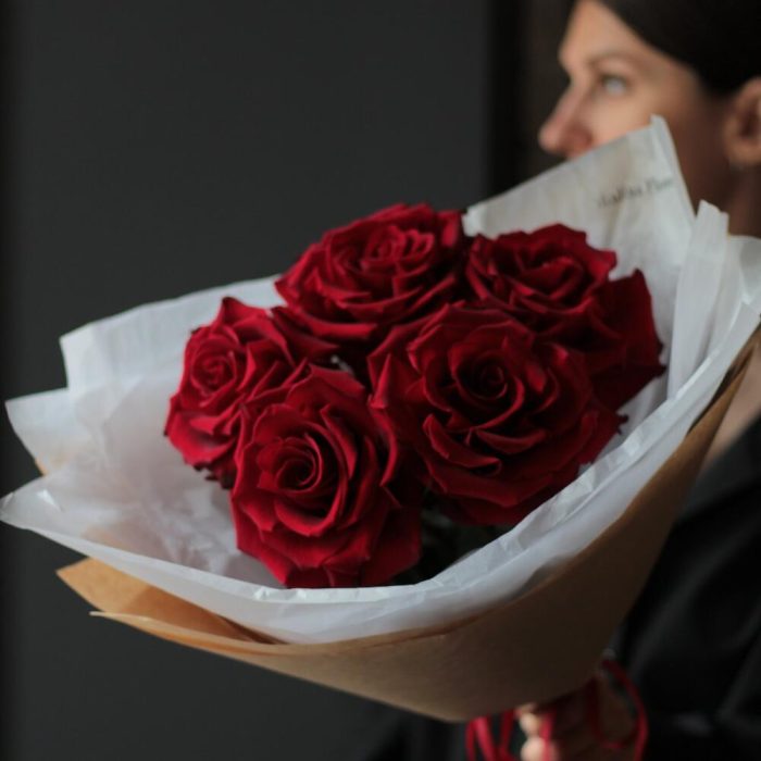 Упаковка дизайнерская – 2 шт.Лента атласная – 2 шт.роза красная эквадор 70 см – 5 шт.