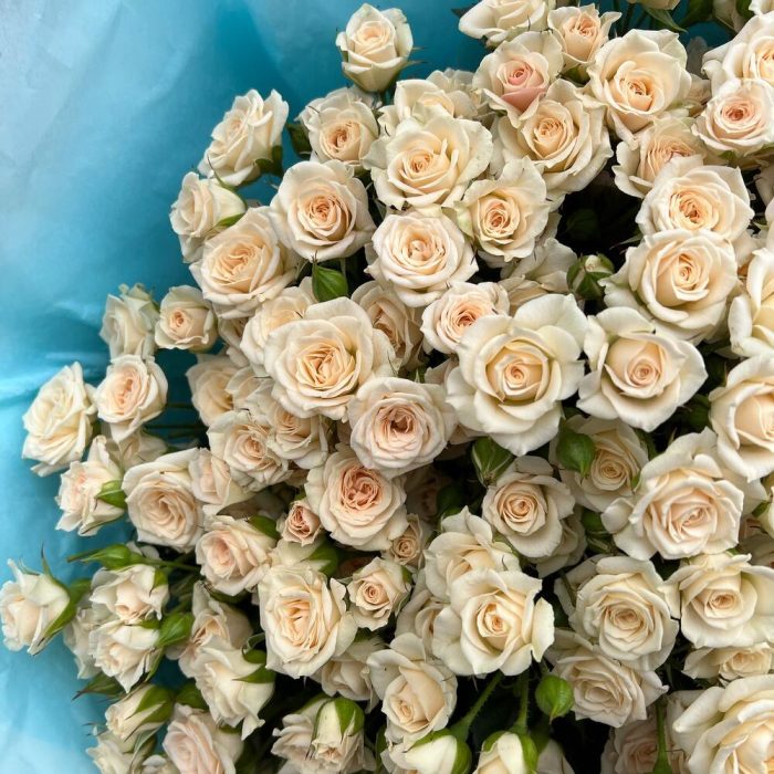 Роза кустовая 60 см – 51 шт.Дизайнерская упаковка – 5 шт.Тишью – 2 шт.Лента атласная – 3 шт.
