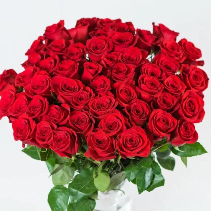 Роза красная – 51 шт.Лента атласная – 1 шт.Пленка прозрачная – 1 шт.