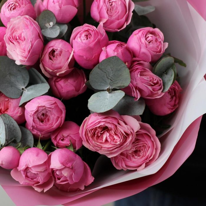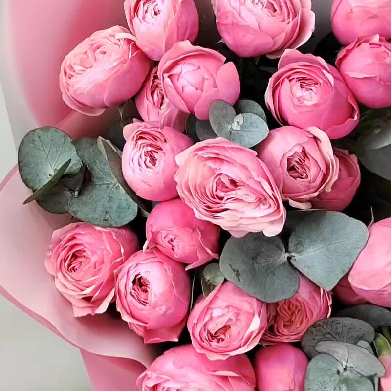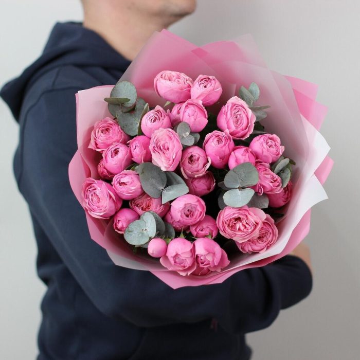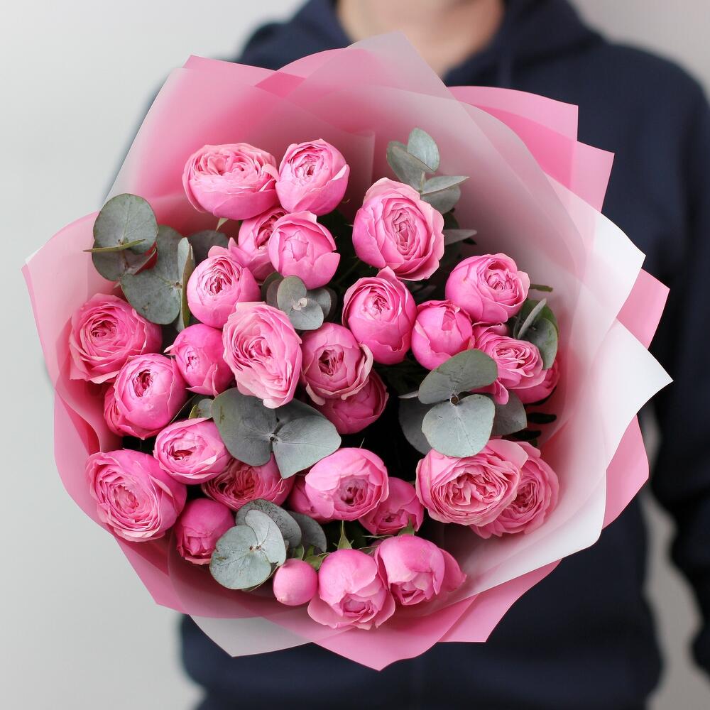 7 кустовых пионовидных роз сильва пинк с эвкалиптом. Букет 25 KimFlo