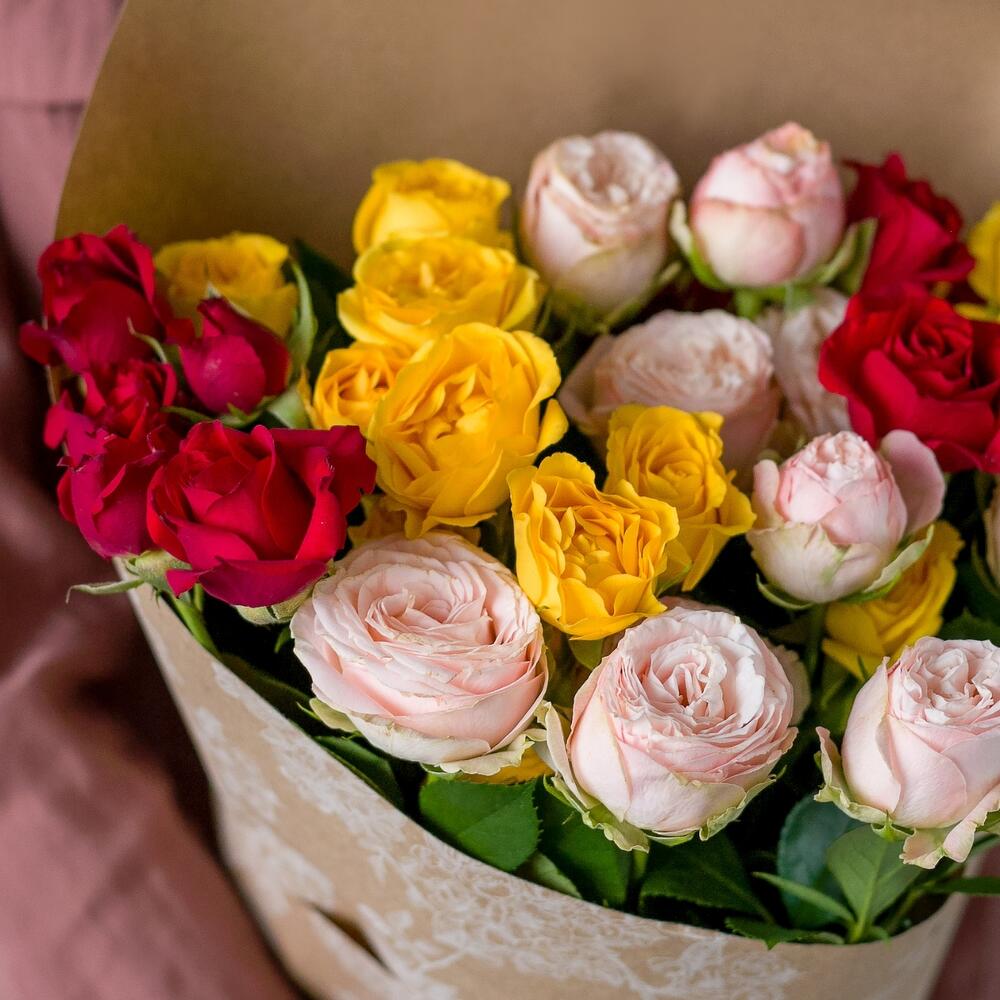 Кустовая роза – 7 шт.Крафт упаковка – 1 шт.Лента атласная – 1 шт.