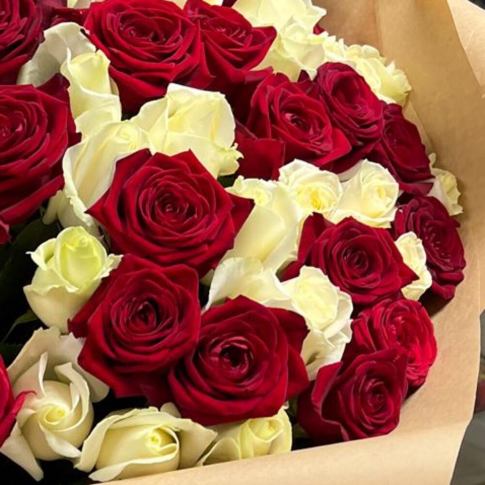 розы эквадор (60 см) – 75 шт.Крафт – 2 шт.Лента атласная – 1 шт.