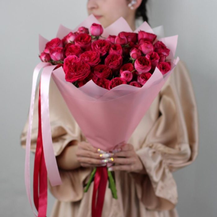Лента атласная – 1 шт.Кустовая роза пионовидная – 9 шт.Матовая пленка – 3 шт.