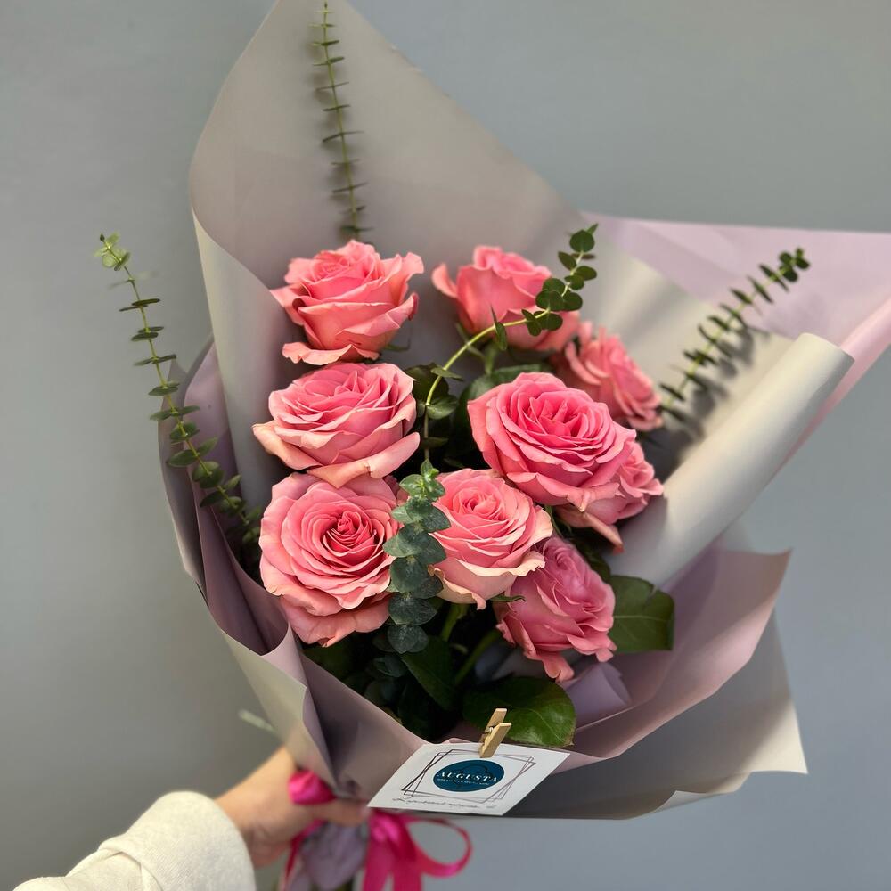 Роза Эквадор – 9 шт.Эвкалипт пучок – 1 шт.Упаковка дизайнерская – 1 шт.Лента атласная – 1 шт.