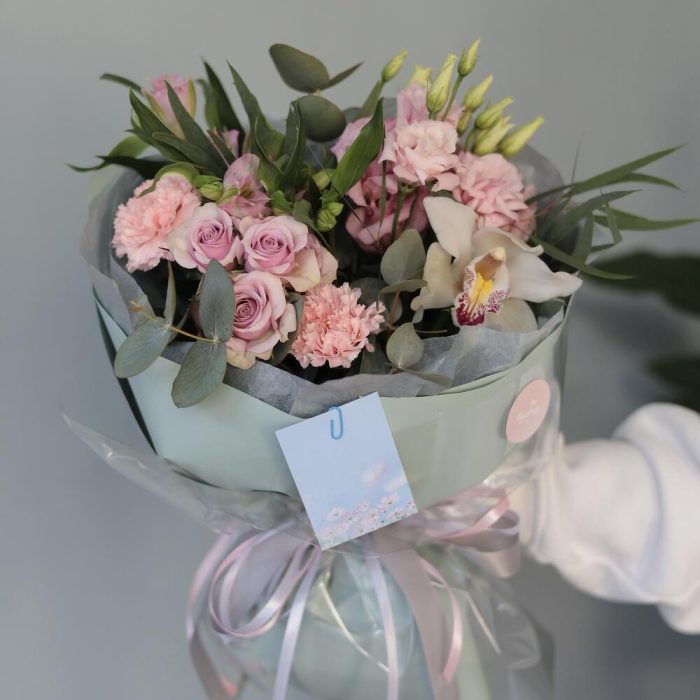 Альстромерия – 1 шт. Гвоздика – 2 шт. Лента атласная – 3 шт. орхидея – 1 шт. Упаковка дизайнерская – 1 шт. Пионовидная кустовая роза – 1 шт. эустома розовая махровая – 1 шт. Карточка для подписи – 1 шт. зелень эвкалипта – 3 шт.
