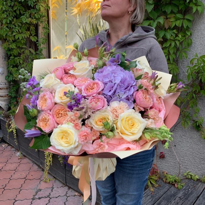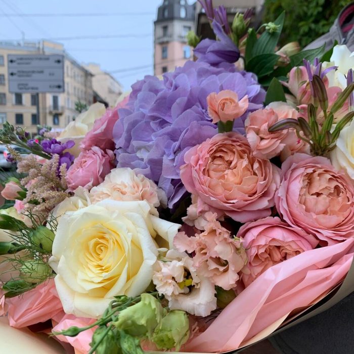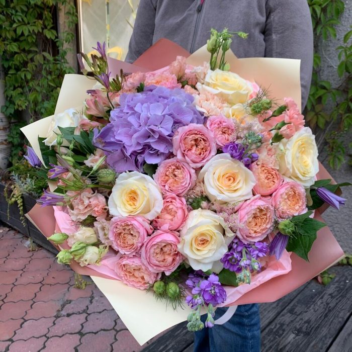 Астильба – 2 шт.Маттиола – 3 шт.Бант – 1 шт.Роза пионовидная – 8 шт.Клематис – 3 шт.Упаковка дизайнерская – 2 шт.Нигелла – 2 шт.Диантус сортовой – 7 шт.Роза кустовая пионовидная джульетта – 5 шт.зелень декоративная – 5 шт.гортензия лавандовая – 1 шт.лизиантус алиса шампань – 3 шт.трителлия – 3 шт.