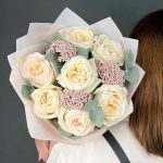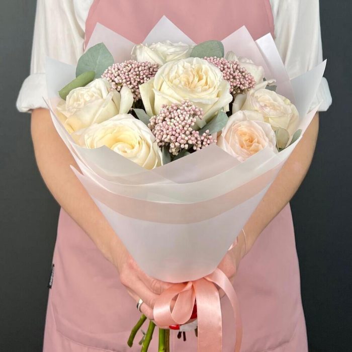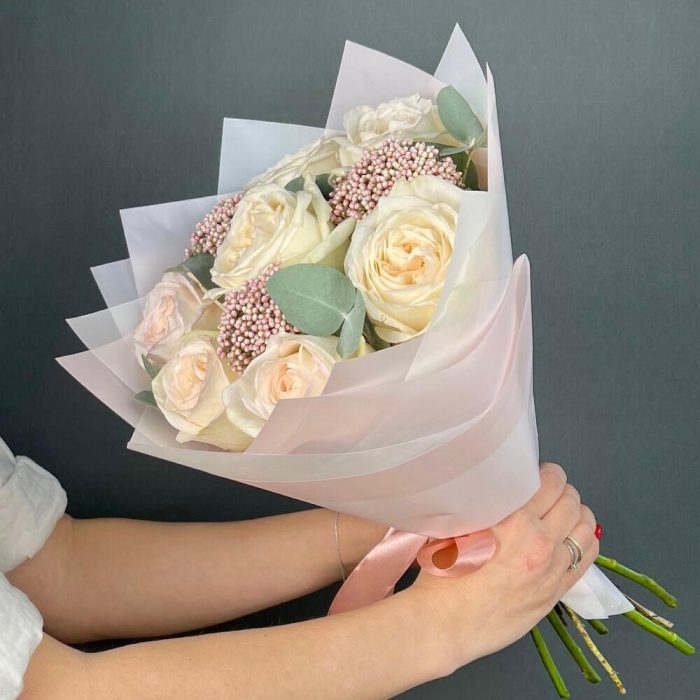 white o’hara роза – 7 шт.Озотамнус – 3 шт.Эвкалипт – 3 шт.бумага дизайнерская – 5 шт.Лента атласная – 1 шт.