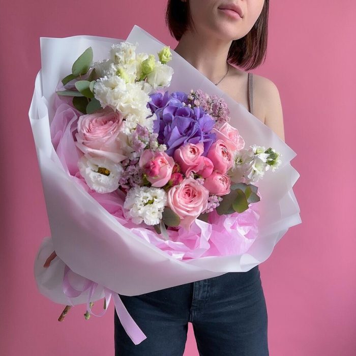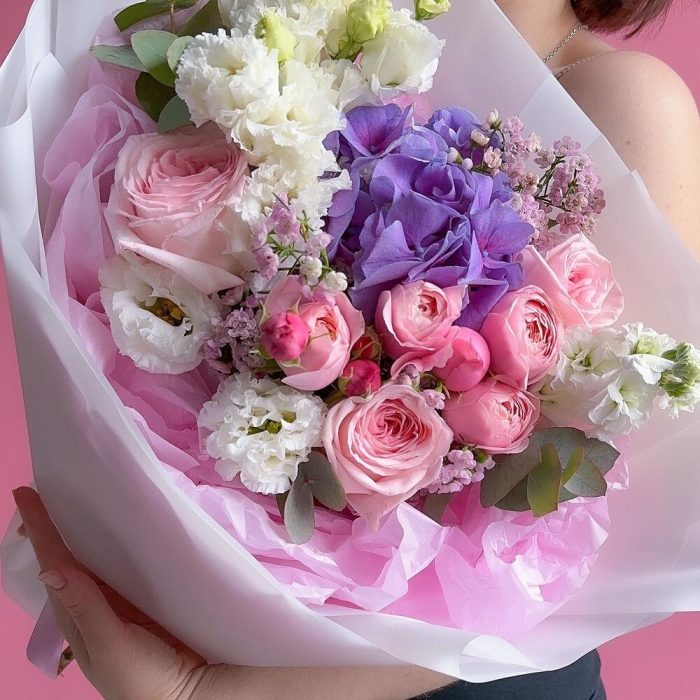 Гортензия – 1 шт.Эвкалипт – 2 шт.Кустовая роза – 1 шт.Хамелациум – 1 шт.Маттиола белая – 1 шт.эустома белая – 2 шт.Дизайнерская упаковка – 1 шт.pink o’hara роза – 3 шт.