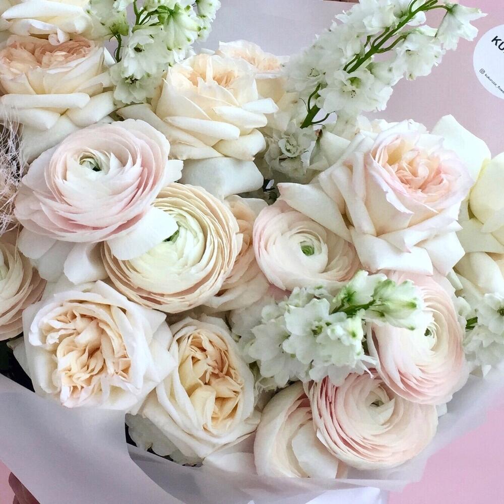 Ранункулюс клуни ханой – 9 шт.пионовидная роза white o’hara – 10 шт.Дельфиниум – 6 шт.сухоцвет паникум – 1 шт.Пленка матовая – 3 шт.Лента атласная – 1 шт.