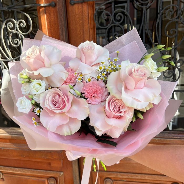 Лизиантус – 1 шт.Ромашка – 2 шт.Гвоздика – 2 шт.Фисташка – 1 шт.Французская роза – 5 шт.Открыточка с вашими пожеланиями – 1 шт.Шоколадка – 1 шт.Дизайнерская упаковка – 1 шт.