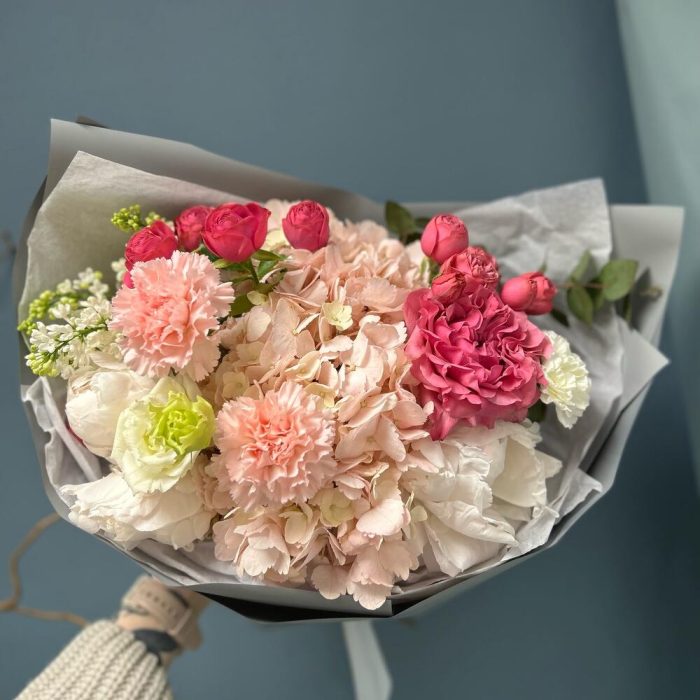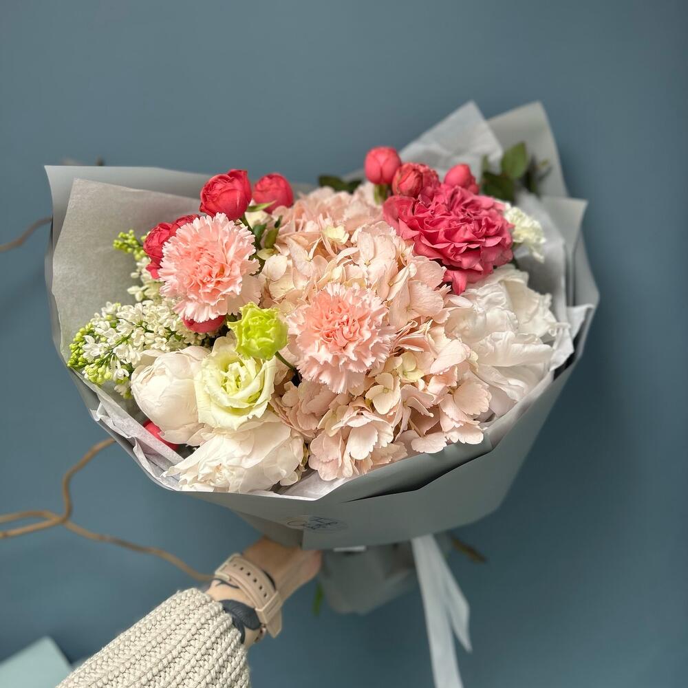 Эвкалипт – 1 шт.Сирень – 1 шт.Пион – 3 шт.роза кантри блю – 1 шт.Роза кустовая – 2 шт.Упаковка дизайнерская – 2 шт.Тишью – 3 шт.