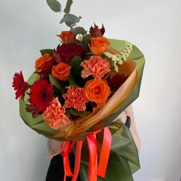 Роза – 6 шт.Гербера – 3 шт.Диантус – 3 шт.Салал пучок – 1 шт.Статица – 1 шт.Упаковка дизайнерская – 6 шт.Лента атласная – 2 шт.