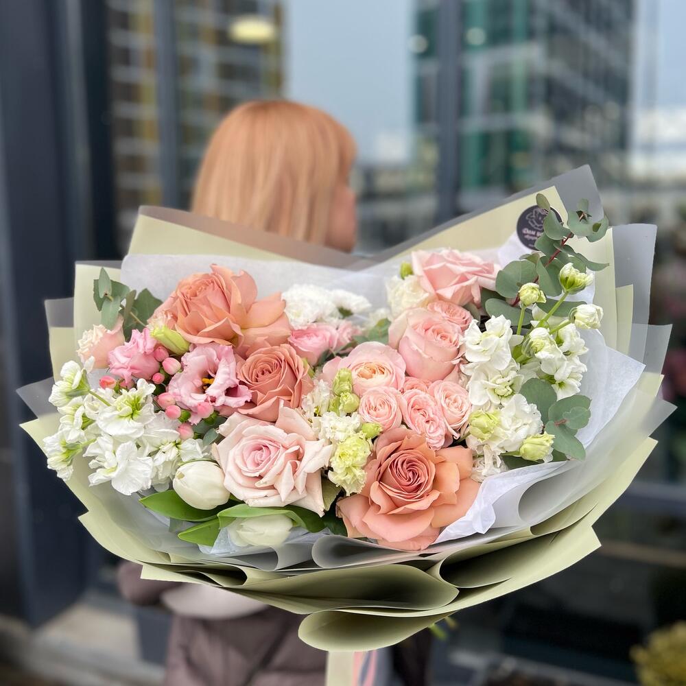 Гиперикум – 1 шт.Лизиантус – 1 шт.Маттиола – 2 шт.Тюльпан – 2 шт.Эвкалипт – 1 шт.Кустовая роза – 2 шт.Сантини – 1 шт.Пионовидная роза – 2 шт.Атласная лента – 1 шт.Одноголовая роза – 5 шт.декоративная упаковка – 1 шт.