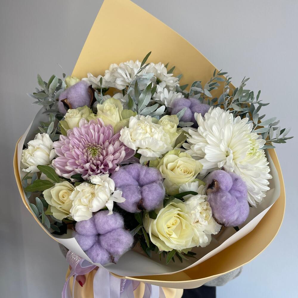Хризантема кустовая – 1 шт.Хризантема – 1 шт.Гвоздика – 4 шт.Лента атласная – 2 шт.Пленка матовая – 6 шт.Хлопок натуральный – 5 шт.Роза россия белая – 7 шт.фисташка зелень – 5 шт.россана – 1 шт.