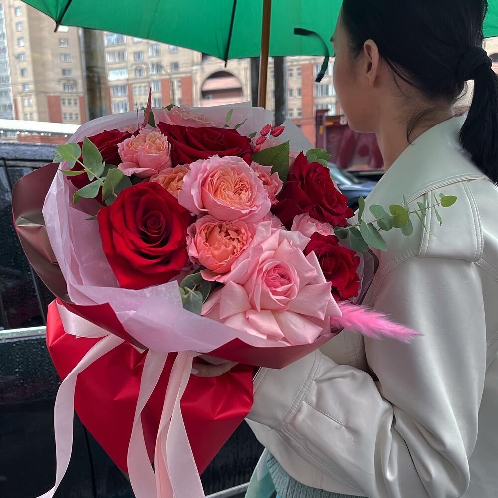 Лента атласная – 2 шт.Тишью – 4 шт.Пионовидная роза – 2 шт.Салал листья – 4 шт.Сухоцвет – 5 шт.Пленка матовая – 4 шт.красная роза 60 см – 5 шт.white o’hara – 1 шт.
