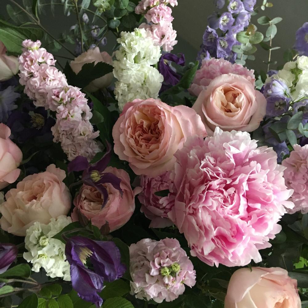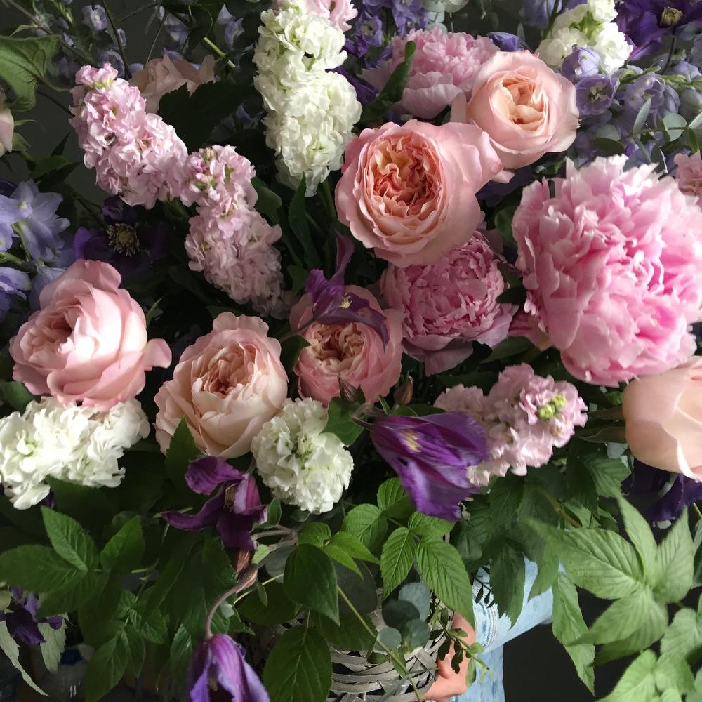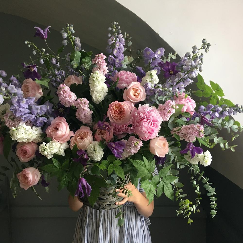 Пион – 5 шт.Пионовидная роза – 11 шт.Дельфиниум – 7 шт.Маттиола – 15 шт.Клематис – 5 шт.Эвкалипт – 9 шт.малина ветви – 5 шт.Корзина – 1 шт.Оазис – 3 шт.