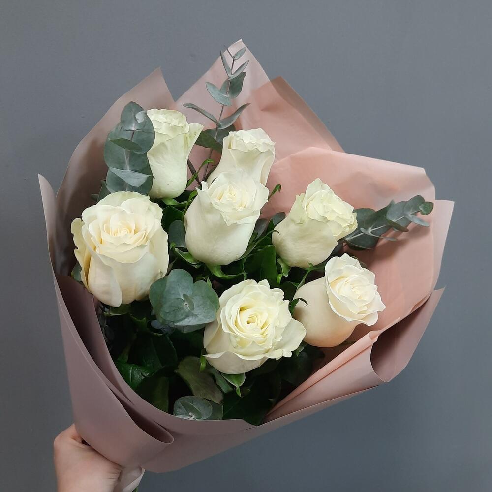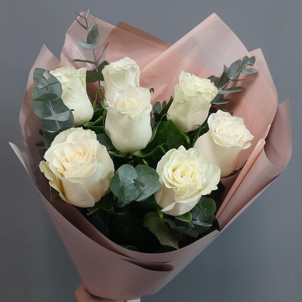Белые розы и Эвкалипт ( 7 штук )