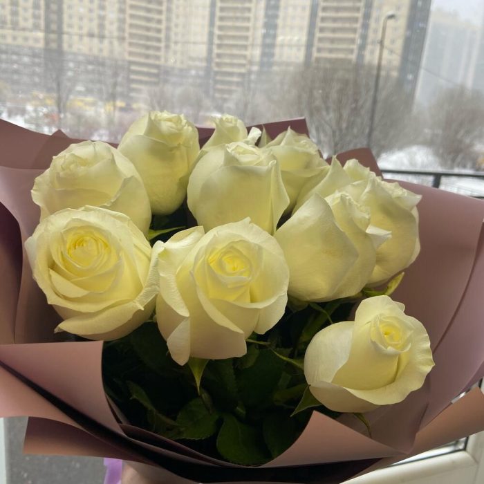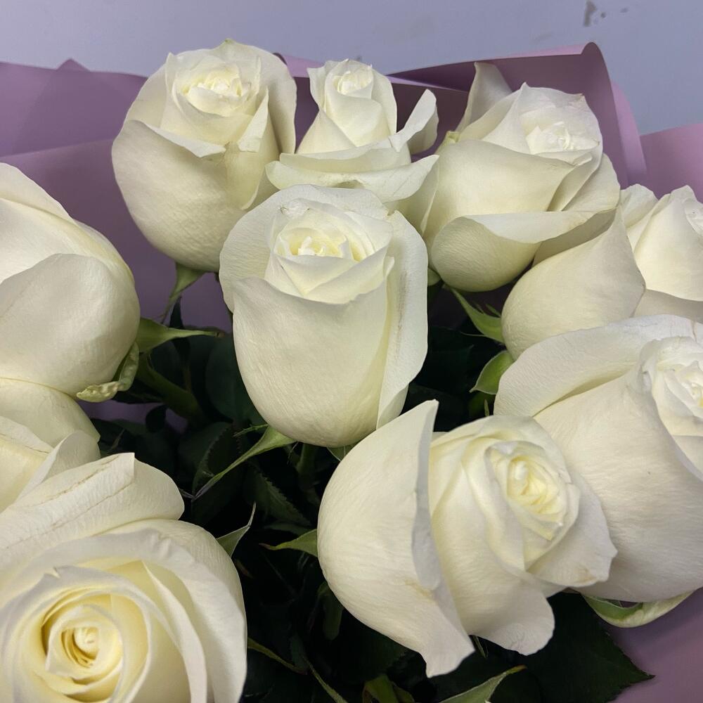 Лента – 1 шт.Упаковка дизайнерская – 1 шт.роза белая прауд – 11 шт.